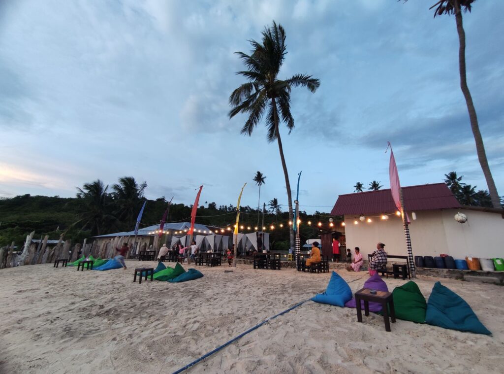Selain dapat menikmati pantai dengan pasir putih sekaligus melihat proses matahari terbenam, pengunjung juga dapat menyantap makanan serta minuman yang sangat menggugah selera.